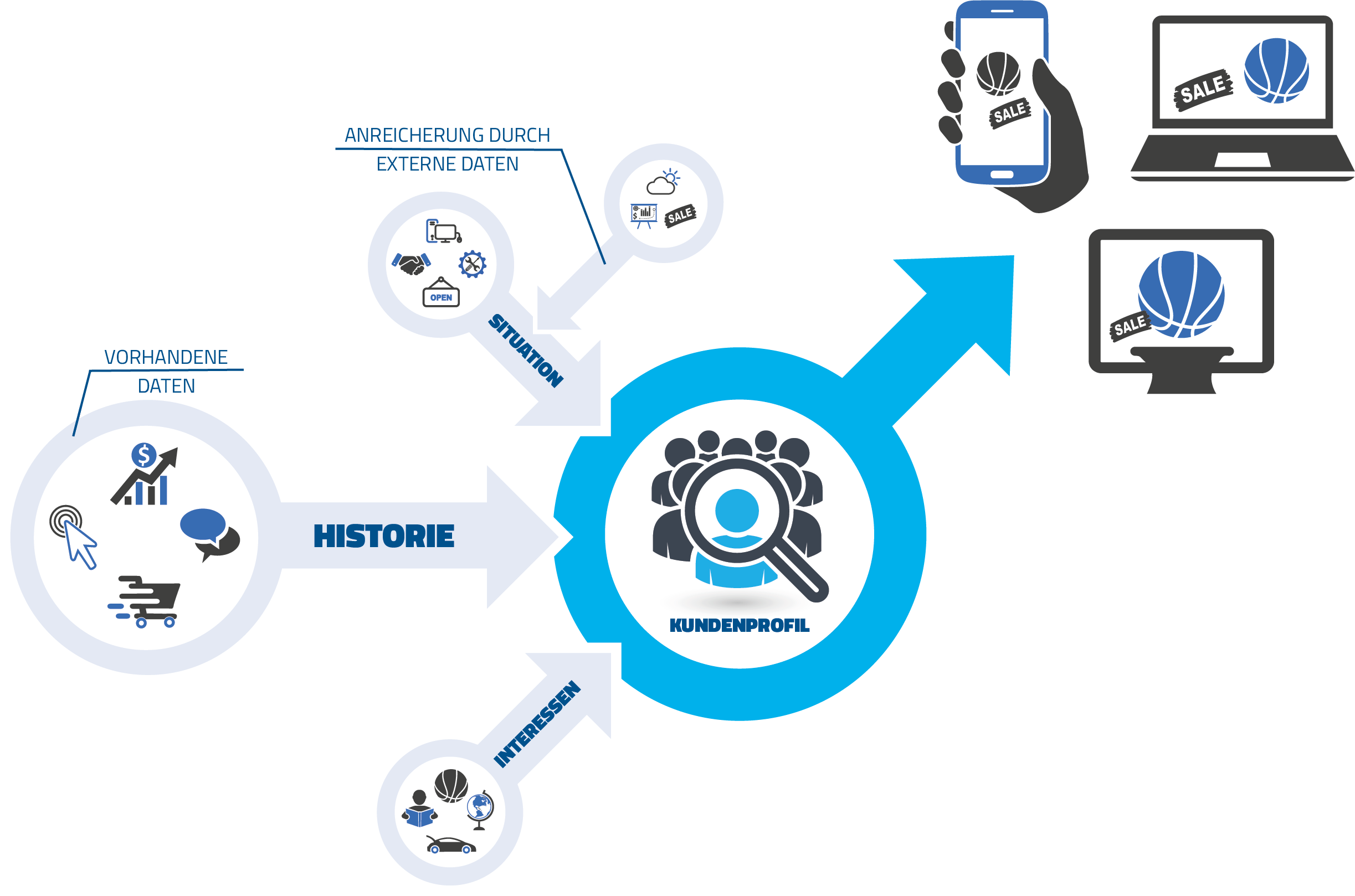 Intelligente Datenaufbereitung durch supervised und unsupervised Learning sowie DSGVO-konformes Clicktracking und Interessenanalyse.